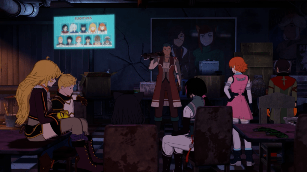 Then Tyrian Callows comes into the belly chamber to rag on Cinder for a bit; I think if he had the chance to kill her, he wouldn’t hesitate to take it. This is followed by the entrance of Hazel Rainart (I despise his belted vest and the bizarre-looking ribs bulging from his exposed sides), Emerald Sustrai (I want to like her new design, but the fishnets covering her upper arm sleeves bug me), and Mercury Black (his decent costume revision amplifies his air of haughty indifference). Aside from Cinder, Neo, and Salem, Emerald is one of the antagonists who I actually find to be compelling, so I’m glad we’ll be seeing more of her. I find it hilarious when they call Arthur Watts a “necessary sacrifice,” as if it hurts them to lose that slimy turdloaf.