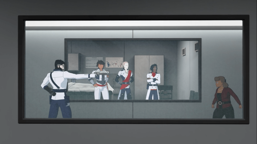 After a brief segment where Ironwood calls Penny and fails to convince her to return to him (her headshot has been added to the fugitives list, so I don’t know why Ironwood would expect her to believe she’s still on his good side), we segue to the Atlesian military. The Ace Ops members are looking at Clover Ebi’s corpse, and wow, the show just mercilessly throws his death in our faces. The general has a talk with Winter Schnee, who is still recovering from her injuries at the end of last season. Then Councilmembers Sleet and Camilla come in to slam Ironwood for enacting martial law, at which point he declares, “I’m going to do everything I can to defend this kingdom, no matter the cost,” and shoots Sleet dead in front of Winter and Ace Ops. Oh yes, he won’t be getting off the tyrant track any time soon. I’m not shocked he did that after trying to kill Oscar in a similar manner, but now there’s definitely no possibility for a redemption arc. I’m guessing he left Camilla alive so he has a Councilmember who can support his oppression in public and put on the façade that all is A-OK within the government. It’s funny to see Harriet Bree and Winter exchange an “oh shit, are we the fascists?” glance after Ironwood murders Sleet in cold blood.