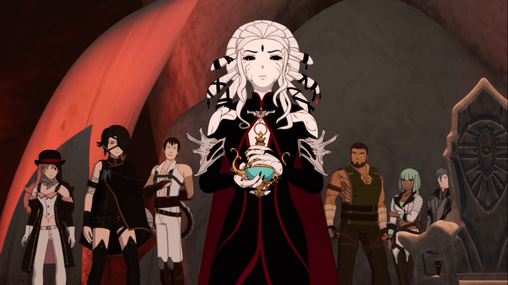 “Divide,” directed by Kerry Shawcross and co-written by him and Kiersi Burkhart, kicks off with a shot of who I’m assuming is a young Cinder Fall scrubbing the floor, which I interpret as an homage to Cinderella. Then we cut to Cinder in the present day flying a ship with Neopolitan, or Neo for short, to that weird Whale Grimm up in the sky. It seems to have taken inspiration from the Leviathans in The Avengers, except in this case, the ribs look like landing gear and the villains convene in a luxurious belly chamber inside the Whale. Funny thing is, that’s not too strange compared to the other crap that’s gone down. Cinder hands over the Relic of Knowledge to Salem (who is still wearing that cleavage dress of which I’m not a huge fan) and claims she retrieved it by herself, taking credit for Neo’s work. The peeved look on Neo’s face only deepens when Cinder goes on to call her a “valuable asset,” as if she’s property, and yep, it’s very obvious she’ll betray Cinder sooner or later.