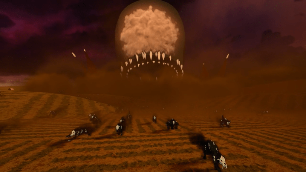 Okay then, let’s get into RWBY, the fantasy anime-style web series from Rooster Teeth Animation. Chapter 7 of Volume 8, “War,” was released on Rooster Teeth FIRST on December 19, and it was directed by Connor Pickens and written by Kiersi Burkhart, with additional writing from Miles Luna. We open on the Atlas military in the farmland outside the city repelling the Grimm that constantly spawns from Monstra’s oily goop and its huge maw, and General Ironwood opens up the underground subway to get the citizens the hell out of Dodge. The sign reading “Pickens Square Station” is a nod to the director of this chapter and the head editor of the show since Volume 3. The girl who points at the flying Grimm up above and says “Dad? Look!” as though they’re a swarm of butterflies strikes me as strangely funny.