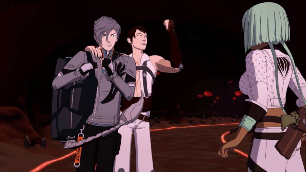 Emerald tells Mercury everything she found out as he packs his duffel bag, but he’s unwilling to put any stock in Oscar and Ozpin’s words. He reveals he’s going to Vacuo and makes it clear he’ll continue following Salem’s orders, then says they can’t defeat Salem, especially since Hazel already attempted that and failed. It’s hilarious when he says, “And all of this is pointless, anyway. Salem’s not ending the world,” and Tyrian pops in with maniacal giggles and says, “Of course she is! You’re surprised? Salem is destruction incarnate! Our mistress wishes to see the end of it all! There is no ideal more beautiful. If you couldn’t see that from the start, you must be out of your mind.” I never thought I’d say this after Volume 6, but Tyrian was the chef’s kiss in this scene. Don’t get me wrong, he’s a repellant psychopath who murdered Clover, but he can be fun when the show uses him in the right way. It’s funny that he’s the only one who’s on the up and up while the rest of the circle has been misled into believing Salem is working towards a new world order. Then Mercury, who momentarily looks anxious about Salem’s plan, and Tyrian take off for a flight to Vacuo, meaning we won’t see them until Volume 9. A small part of me feels bad for Mercury having to share a ride with one of the grossest passengers possible, while the rest of me is luxuriating in schadenfreude. Since it appears that Volume 9 will be set in Vacuo, I hope this means Sun Wukong will come back, because we haven’t seen him in a while and he’s one of the few young males in RWBY who doesn’t ooze toxic masculinity. Side note: why was that Beringel spying on them from its perch up on the ceiling? We better see the heroes fight those flying monkeys sometime.