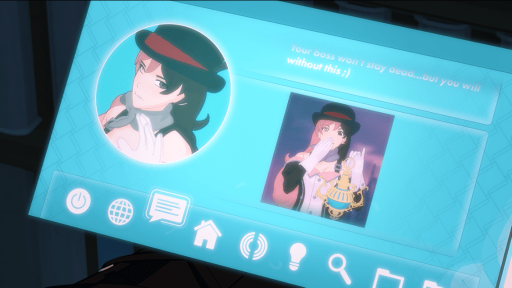 Cinder receiving Neo’s message is my hands-down favorite beat in the episode and one of my favorites in the entire volume. “Your boss won’t stay dead… but you will without this ;)” her text reads. “If you want her name, you know what you owe me.” Neo being her own boss after realizing that she doesn’t have to put up with any more of Cinder’s shit—lovely, just absolutely lovely.