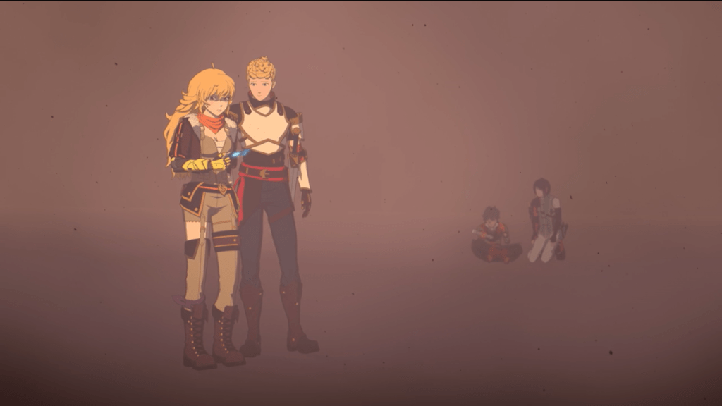 We cut to Yang’s crew arriving at Schnee Manor and reuniting with their teammates, which is when we get the Bumblebee moment—yes, the one where Yang tenderly touches Blake’s cheek, then the two of them lean in and rest their brows together. The way this beat is animated and paced would have been ideal for a kiss, a sweet gesture for them to share after being separated for almost this whole volume. But no, the show keeps gay-coding them and insisting that they need more romantic buildup despite Arkos and Renora having already gotten their kisses. I really do wonder how the script describes that moment and what the animators discussed when they made the conscious decision to frame it so affectionately.