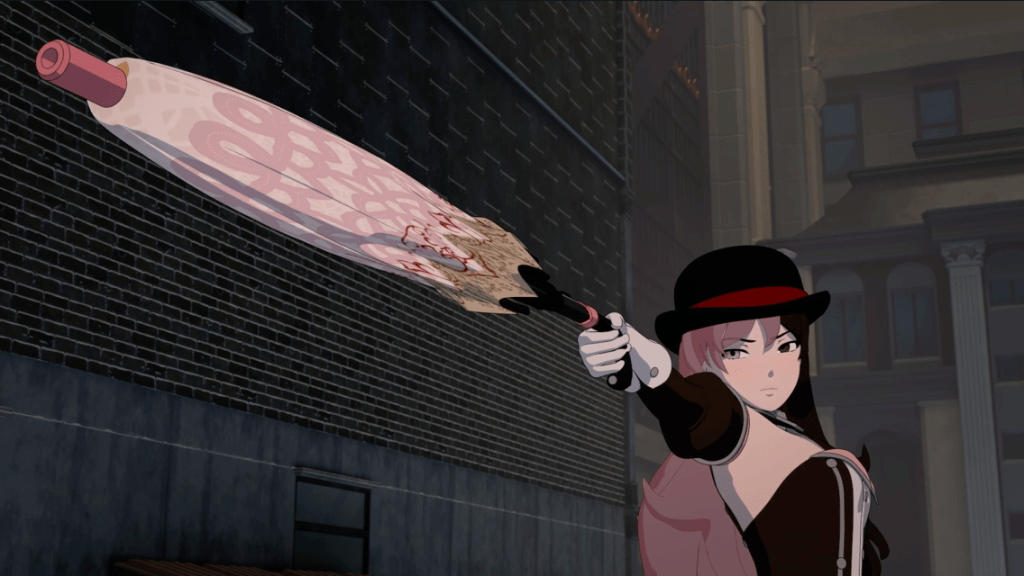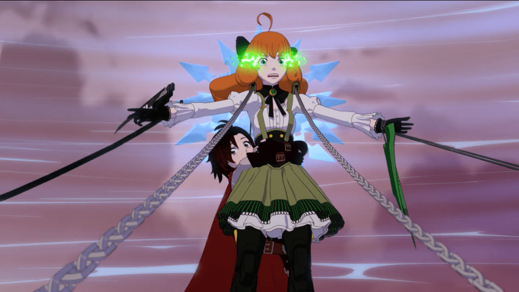Then we hear glass breaking, and everybody rushes out of the Manor to find Penny Polendina restarting her fight with Watts’s virus. Ruby, Ren, Blake Belladonna, Weiss, and Emerald (I recently learned her chain-sickle guns are known as Thief’s Respite) all pitch in to prevent Penny from leaving, and she pleads Ruby to kill her so that the Winter Maiden powers will transfer to Ruby. Nora assures Penny that the virus is “just a part of you, remember? If you were only a machine, you never could have fought back for this long.” This gives Ruby the idea to tell Jaune to boost Penny’s Aura as a way to ward off the virus, albeit temporarily. Penny says the virus remains in her, and Ruby says, “But you’ve got an Aura, Penny, a soul. That’s who you are—our friend, not a machine.” I don’t know if these kids missed the memo, but we’ve known Penny has an Aura since Volume 2. Why are they acting so dumbfounded at the notion that Penny is her own person? She’s repeatedly shown empathy for others, including this very beat where she’s willing to sacrifice herself for the sake of everyone else’s safety. It’s been genuinely enthralling to watch her struggle with her identity over the past two volumes, but of course the show has to bungle up her character growth.