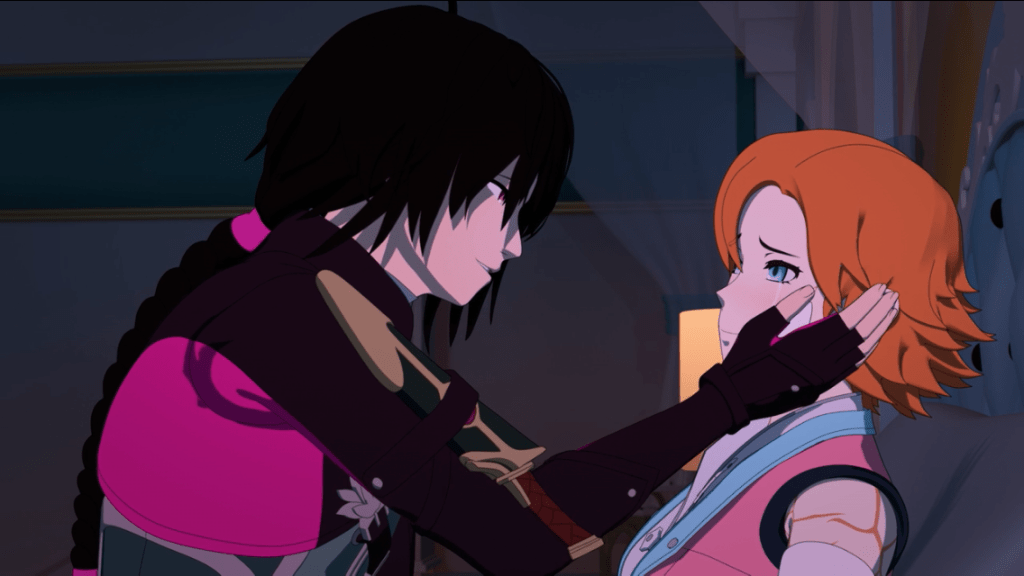 The show gives us a nice beat of comic relief when Jaune awkwardly skedaddles from the room after picking up on the intimate vibes between his teammates. The Renora talk continues with the two of them admitting that they love each other, Nora revealing the heart-wrenching detail about her mom abandoning her and declaring that she needs time away from her partner to figure out her identity, and Ren seeing white petals fluttering around her (contemplation, maybe?), agreeing with her, and then booping her on the nose as a cute callback. As frustrated as I’ve been with the show unnecessarily complicating their relationship over the past few volumes (there were even times when it felt like the show forgot Renora entirely), I appreciate the mature and frank conversation they have to finally confess their love and get in the same headspace together. I’d love for this to have ramifications in the future so that Nora can explore a compelling arc of introspection, but the inconsistent writing of this show doesn’t give me much confidence in that regard.
