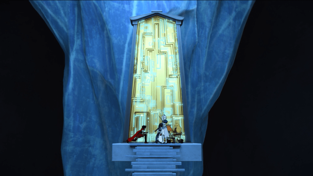 We cut to the present as the gang gets flown up to the hole made by Oscar underneath Atlas after Ironwood shot him off the bridge last season. Ruby somehow uses her Semblance to carry her teammates and Penny through the hole and up to the Vault, even though it seems like too many people for her to transport at once. Immediately after Penny unlocks the door, Ruby utilizes her Semblance again to speed through it and into a verdant space with her companions. There, they switch on the Staff, freezing time around them.