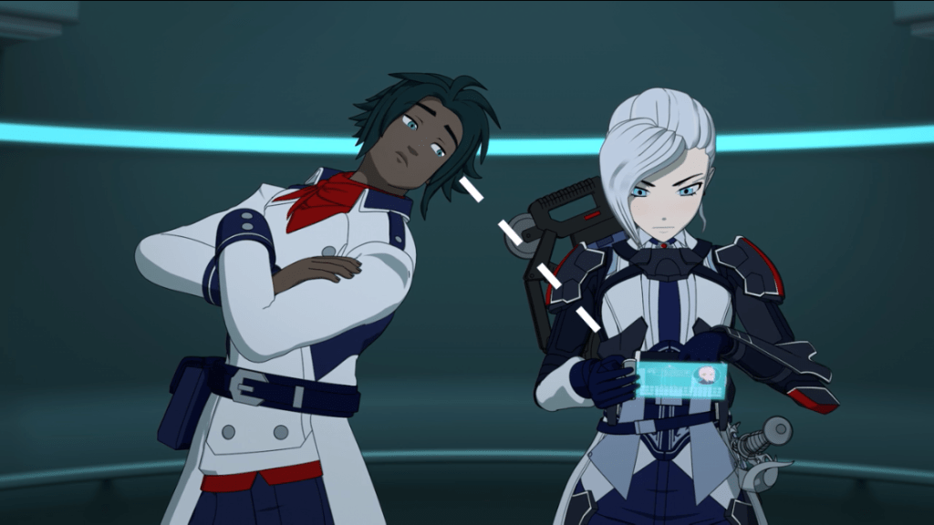 What’s new, readers? Let’s dive into RWBY, the fantasy anime-style web series from Rooster Teeth Animation. Chapter 12 of Volume 8, “Creation,” was released on Rooster Teeth FIRST on March 13, directed by Dustin Matthews and written by Eddy Rivas. We open on Grimm downing a couple Atlesian ships and the third ship escaping the same fate, followed by Qrow Branwen and Robyn Hill storming the dock where Atlesian drones are putting the payload aboard a ship at the same time that James Ironwood, Harriet Bree, Elm Ederne, and Vine Zeki are awaiting Penny Polendina’s arrival at Atlas Academy. Harriet continues to be the general’s most loyal lackey, but judging from Elm and Vine’s slight hesitation, they’ll be the next ones to call it quits. Vine even says that he’s “retracing the steps that led us here,” and that leaves me going, “Yes, aren’t we all? Who knew we’d come to this point after blindly following the orders of a murderous and insane despot?” The despot himself, who is armed with a ridiculously huge blaster, orders the Ace Ops to subdue Qrow and Robyn after getting a tip-off from security, then continues to wait for Penny with Winter Schnee by his side to stop anyone who accompanies her. I’d think he would want an entire troop of drones and soldiers to back him up in that case, but okay.
